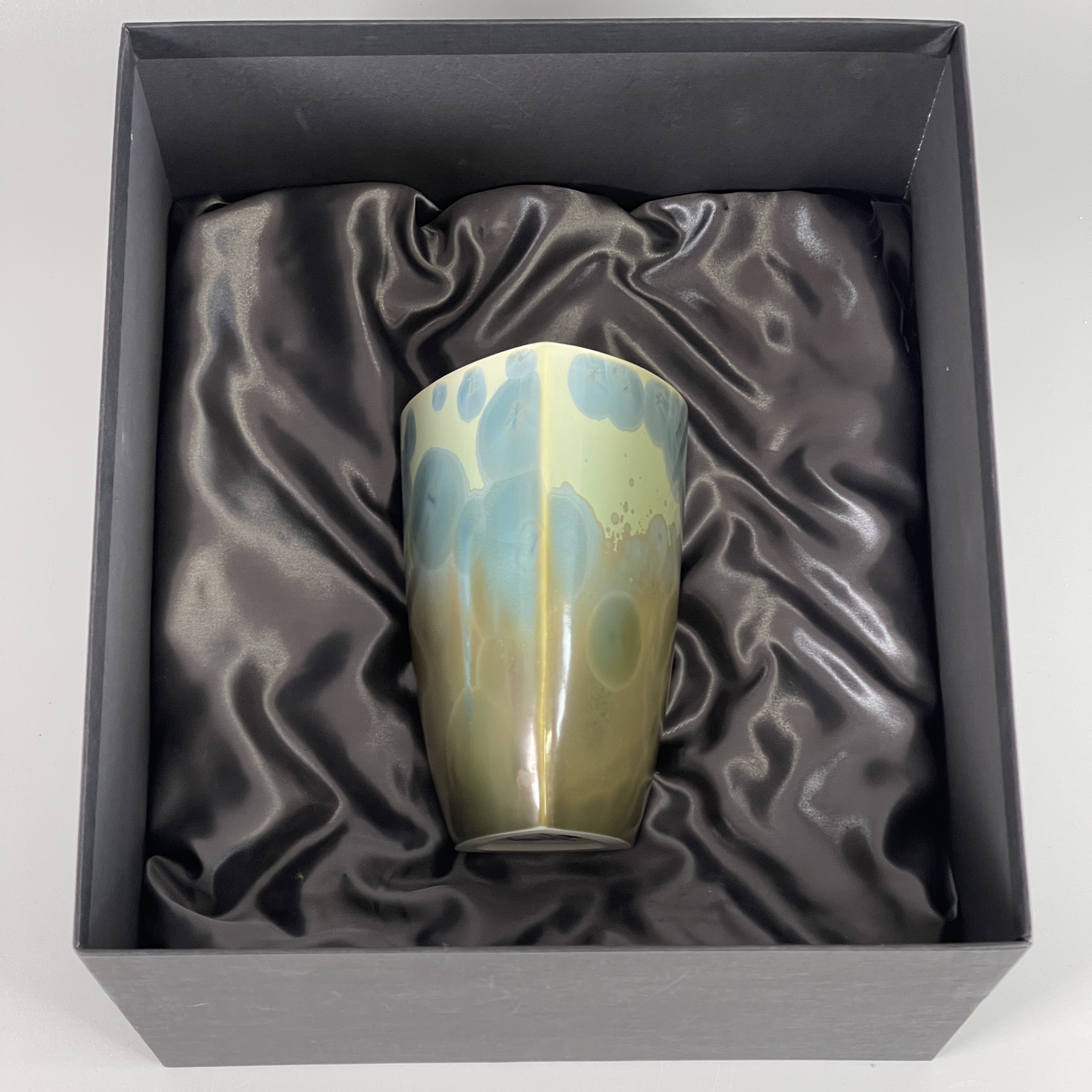 Das Geschenkset besteht aus einem hochwertigen, gut gepolstertem Karton, einer Unikatvase und Dekoration (FORMANO). Die Vase ist mit einer Kristallglasur überzogen und damit in ihrer Struktur einzigartig und nicht wiederholbar. Höhe der Vase: 15,5cm , Breite 10,5cm